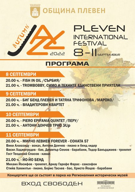 От 8 до 11 септември за шести път в Плевен ще се проведе AUTUMN JAZZ FEST – PLEVEN, организиран и финансиран от Община Плевен. В четири поредни вечери в парка на Регионалния исторически музей ще се представят утвърдени знакови музиканти и млади таланти, групи в българския и европейски джаз, изпълняващи различни направления в джаза - смуут джаз, фюжън, ню фънк и ню джаз, соул, аренби. AUTUMN JAZZ FEST – PLEVEN е едно от най-значимите ежегодни културни събития в града ни, част от Културния календар на Община Плевен.