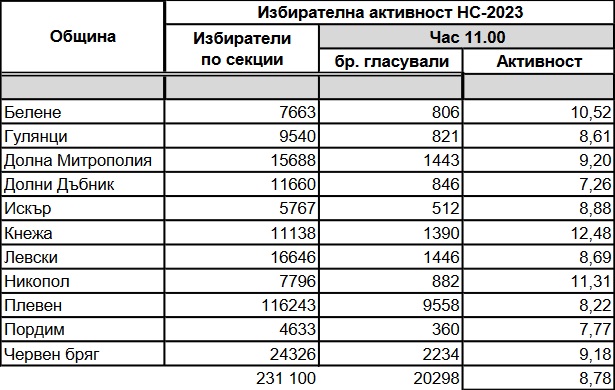 8,78% е избирателната активност към 11.00 ч. в област Плевен в изборите за народни представители. Гласували са 20 298 от всички 231 100 души, имащи право на глас. Toва съобщиха от РИК.