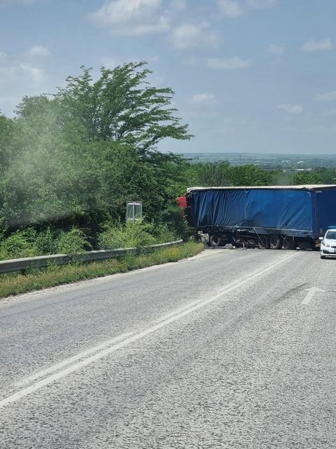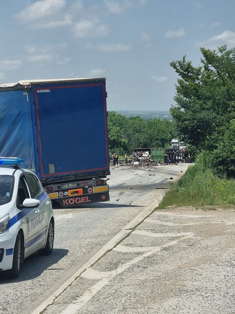 По първоначални данни инцидентът е между тежкотоварни автомобили. На мястото на произшествието са пристигнали полицейски и медицински екипи.