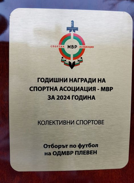 Футболният отбор на ОДМВР - Плевен също получи признание! Плевенчани бяха отличени в категория "Колективни спортове – Регионални клубове", като наградата получи треньорът на тима Калин Григоров!