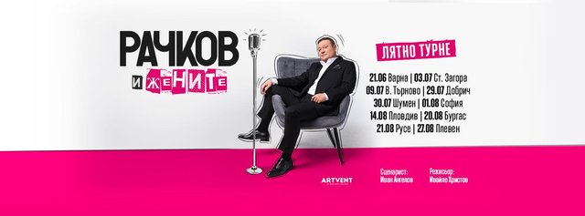 Популярният актьор и комик е на лятно турне с авторското шоу "Рачков и жените", под режисурата на Ивайло Христов и по сценарий на Иван Ангелов.