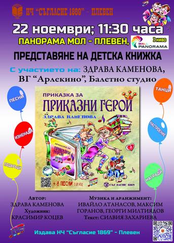 На 22 ноември (събота) от 11:30 ч. в Панорама Мол Плевен ще се състои официалната премиера на най-новия проект на актрисата и драматург Здрава Каменова – детската книга „Приказка за приказни герои“.