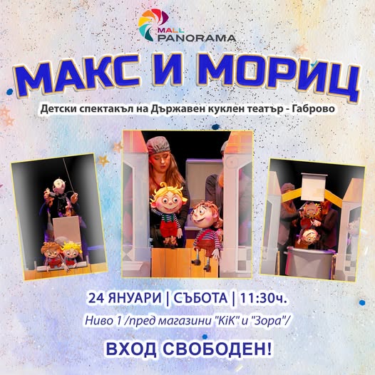 На 24 януари, събота, от 11:30 ч., в Панорама Мол Плевен, Държавен куклен театър - Габрово ще представи кукления спектакъл „Макс и Мориц“.