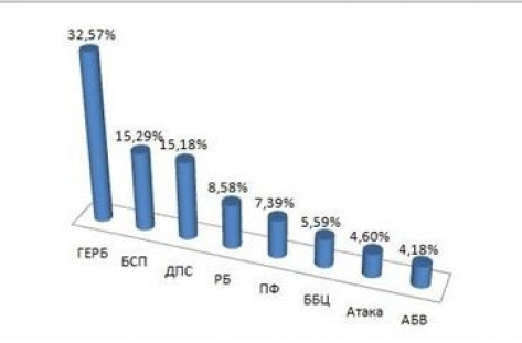 ГЕРБ - 32,57%, БСП - 15,29%, ДПС - 15,18% , РБ - 8,58%, ПФ – 7,39%, ББЦ - 5,59%, Атака - 4,60%, АБВ – 4,18 %
