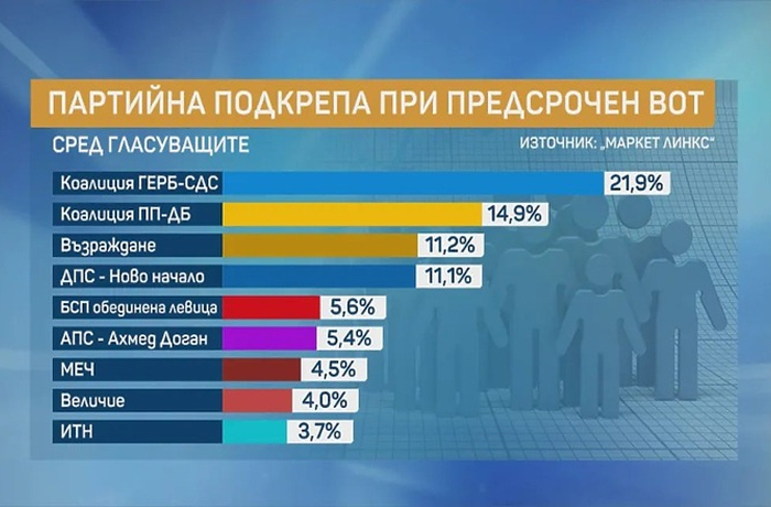 При предсрочен вот коалиция ПП-ДБ е на второ място с партийна подкрепа от 14,9%, третата сила е „Възраждане“, която събира електорат от 11,2%. Веднага след тях е ДПС-Ново начало с 11,1% подкрепа.