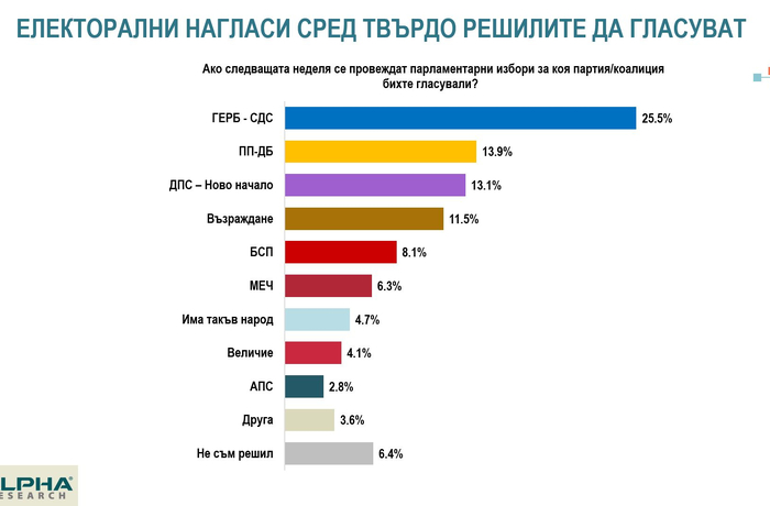 ГЕРБ устойчиво остава първа политическа сила (25.5%), без съществена разлика в резултата нито спрямо по...
